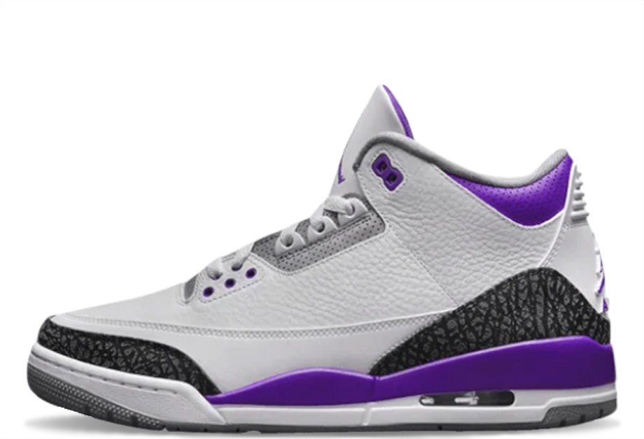 The Air Jordan 3 Dark Iris maintains the enduring iconic look of Hatfield's debut Jordan, with a tumbled white leather upper and elephant print panels on the mudguard and heel. Dark Iris purple accents throughout the eyelets and around the ankle, with matching Jumpman branding on the tongue and heel. The midsole features a visible Air unit, with further purple accents and a light grey rubber outsole completing the colourway. Cop the Air Jordan 3 Dark Iris on KLEKT.