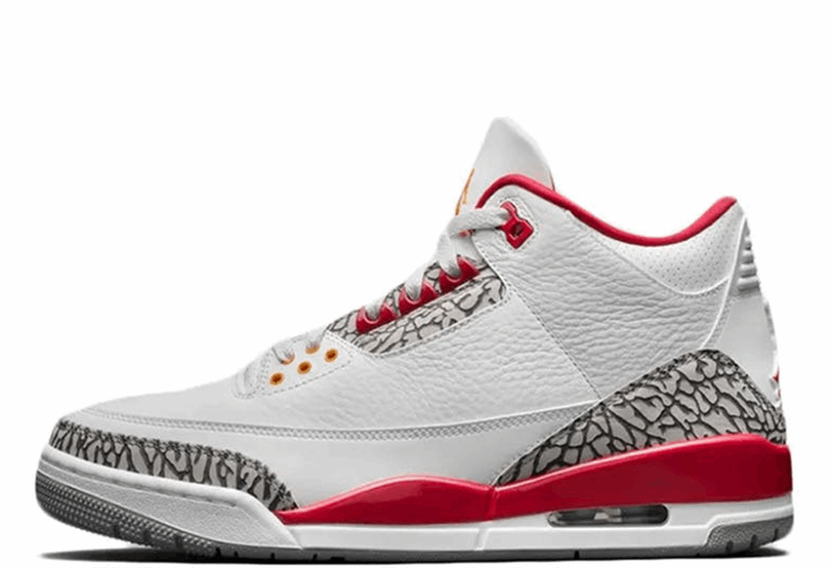 The Air Jordan 3 Retro Cardinal Red's bold accents are found wrapped around the midsole, just above the visible Air unit. These hits of red continue with the Jumpman on the heel, the eyelets, inner lining and insole. The uppers consist of premium white tumbled leather, with the Jordan 3's iconic elephant print making an appearance on the mudguard, heel, and along the eyestays. Gold is then used on the bottom eyelets and the embroidered Jumpman on the tongue, giving the colourway some extra flavour. Cop the Air Jordan 3 Retro Cardinal Red on KLEKT.