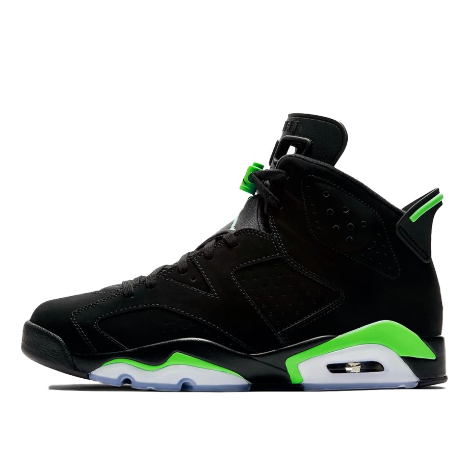 A neon dream, the Air Jordan 6 Retro Electric Green pays homage to the historic Air Jordan 6 Oregon with a slightly more obtainable price point. What are you waiting forKeeping things clean, this stealthy sneaker sports a premium nubuck construction hued in a sleek all-black tone from heel to toe a barely-there cutout Jumpan embellishes the heel alongside cutout perforations across the upper. High contrast hits of lucid neon green paint the structured heel collar, lace toggle and tongue Jumpman icon all glowing against the dark backdrop. Underfoot, a tri-coloured sole sees glow-in-the-dark inserts: including the iconic air unit framed by luminous green panels brought together by black, infused with Nike Air Technology for maximum comfort with every step. The Air Jordan 6 Retro Electric Green is a must-have for every sneakerhead.