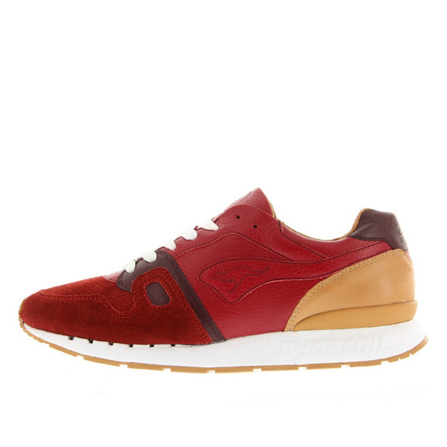 The Kangaroos x Afew Coil R-1 Omnicoil II 2 Jelly features a soft Buttero leather upper in Jelly Red, complemented by a matching red Meriva suede toe box and a smooth tan leather heel panel stamped with Afew's logo. Get yours from KLEKT now.