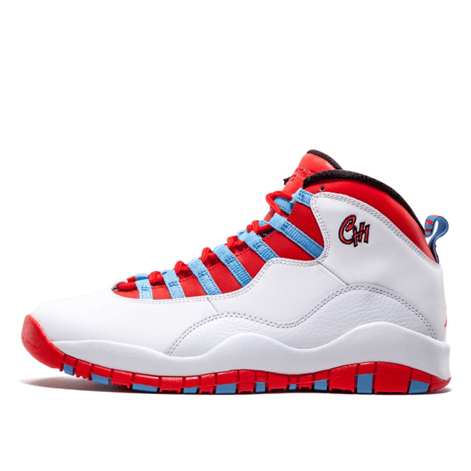 As part of Jordan's City Pack from April 2016, the Nike AJ X 10 Retro Chicago Flag pays homage to the city that elevated Jordan to superstardom; Chicago. The sneaker borrows its colours from the white, university blue, black and bright crimson of the flag of Chicago, replacing the traditional embroidery at the collar with /