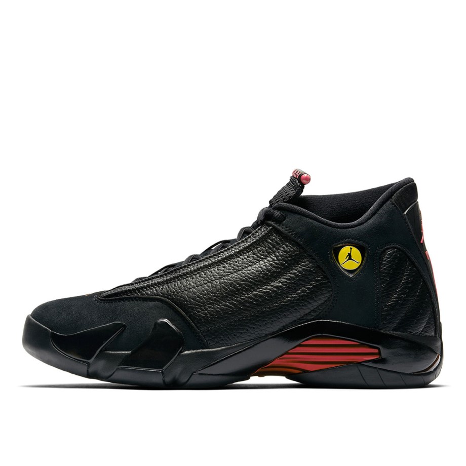 The Nike AJ XIV 14 Retro 'Last Shot' first dropped in 2018 and marked the third retro release from the Jordan 14s. Dressed in a black-based, perforated leather upper with suede detailing and red accents. Get yours from KLEKT now.