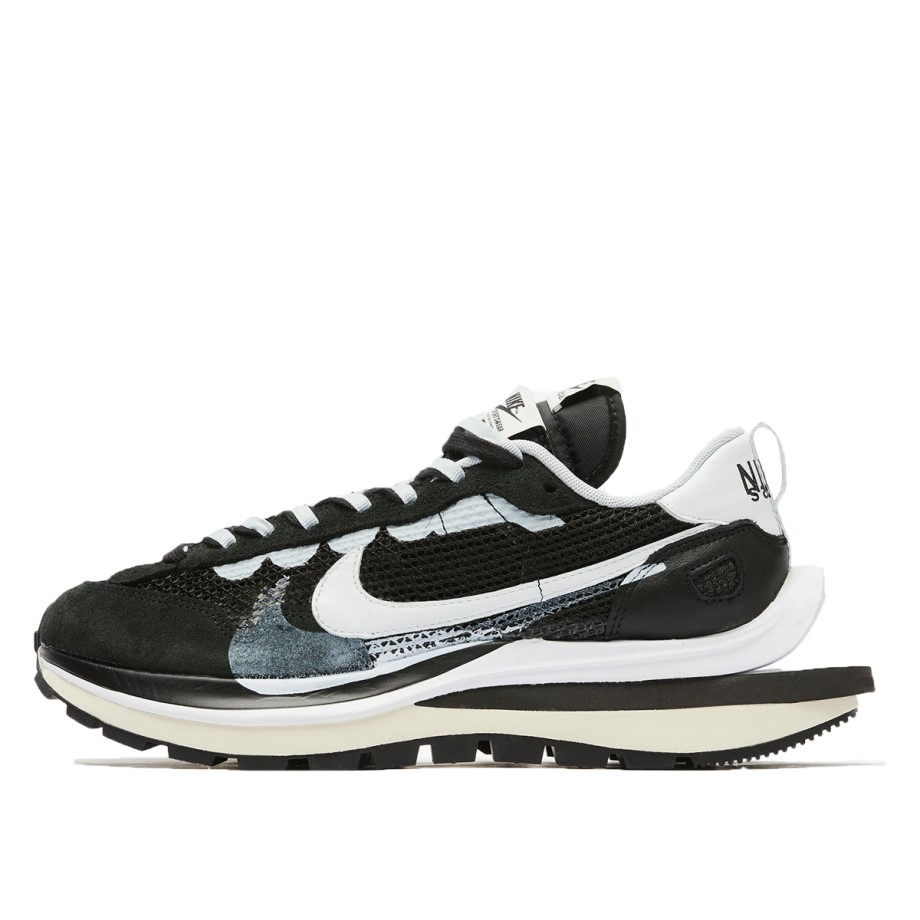 sacai x Nike Vaporwaffle Black have finally made their long-awaited appearance. Released alongside its Sail Sport Fuchsia counterpart the black colourway is proving to be the firm favourite of the pair. The sacai x Nike Vaporwaffle Black is the perfect combination of Abe's distinctively sleek and minimalist design style combined with the functionality and technical prowess of Nike results in a distinctive yet versatile sneaker. A luxurious combination black suede and waffle upper, offset by the striking white leather swoosh will have you seeing double. Double stacked soles adding height and length to the sneakers silhouette, paired with the double swooshes and dual tones laces has become a signature of sacai x Nike's covetable collaborations.