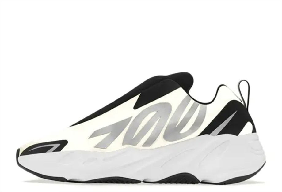 The Yeezy Boost 700 MNVN Laceless Analog comes in a clean white upper, with reflective silver '700' branding on the sides. This laceless model also features a black, ergonomic slip-on tongue. The upper sits on a thick white midsole, with its cloud-like Boost foam revealed in the pattern of the distorted rubber outsole. Cop the Yeezy Boost 700 MNVN Laceless Analog on KLEKT.